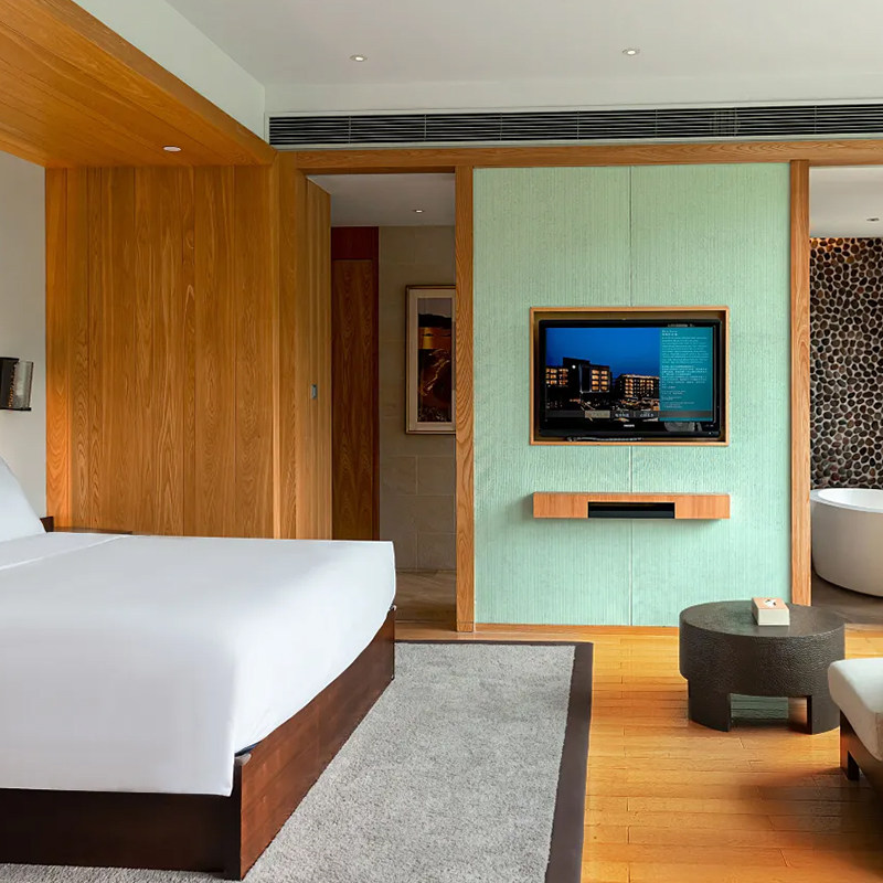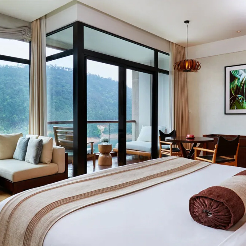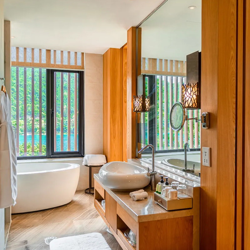 酒店坐落于以喀斯特山地和丰富花果植被著称的羡山半岛,为差旅人士打造天然氧吧。清晨在鸟鸣中醒来,推开窗即见层峦叠翠与湖光潋滟;午后漫步于果园小径,呼吸清新空气,有效缓解高强度工作带来的焦虑与疲劳。这种沉浸式自然体验,远胜城市酒店的封闭环境,助力差旅者快速恢复专注力与创造力。