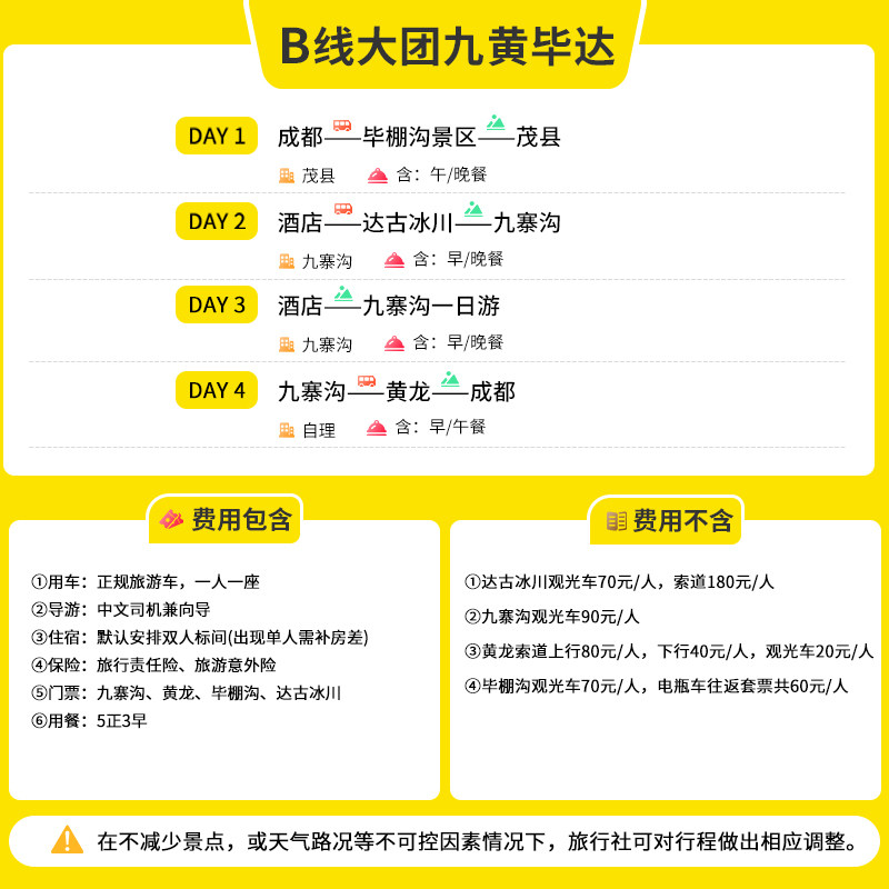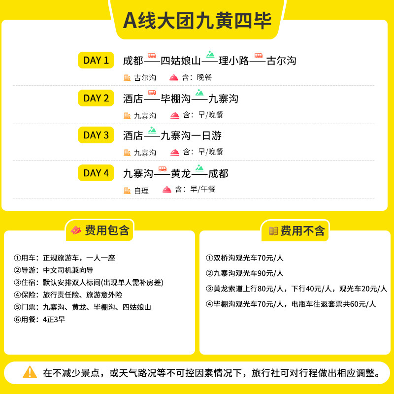 4天3晚紧凑行程科学串联川西四大世界级景点——九寨沟、黄龙、四姑娘山、毕棚沟及达古冰川,避免重复路线与无效耗时。专为时间宝贵的差旅人群设计,一天一景、节奏合理,确保在有限假期中高效打卡多个自然奇观,最大化旅行价值。