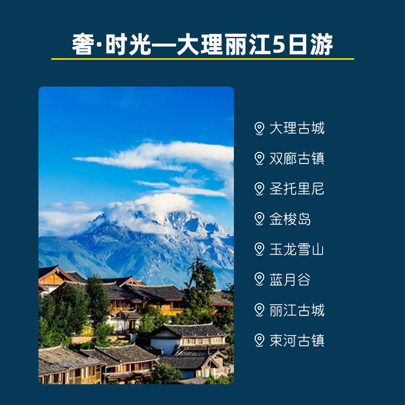 精心规划的5天4晚行程无缝衔接丽江与大理两大目的地,涵盖玉龙雪山、蓝月谷、双廊、束河古镇等核心景点,避免冗余交通耗时。对于时间紧凑的差旅人群,此路线最大化利用有限假期,在高效完成工作之余,快速切换至度假模式,实现‘工作+休闲’的完美平衡。