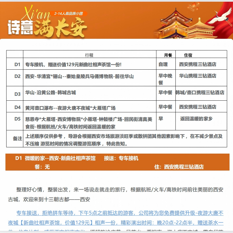 针对从揭阳、成都、乐山三地出发的差旅人群,本产品包含往返机票及12人精品小团服务,避免大团冗长等待,提升出行效率。行程精准覆盖西安及延安方向的核心资源,如壶口瀑布、大唐不夜城、大雁塔广场等,确保您在有限时间内高效打卡高价值景点。小团模式更便于临时调整节奏,契合商务人士对时间掌控的高要求。