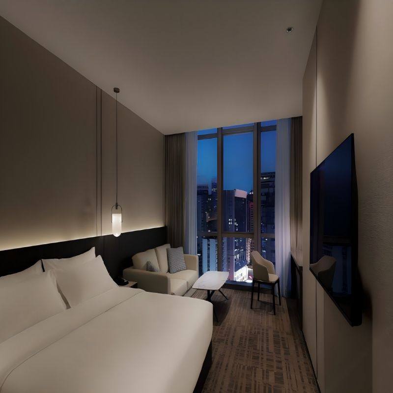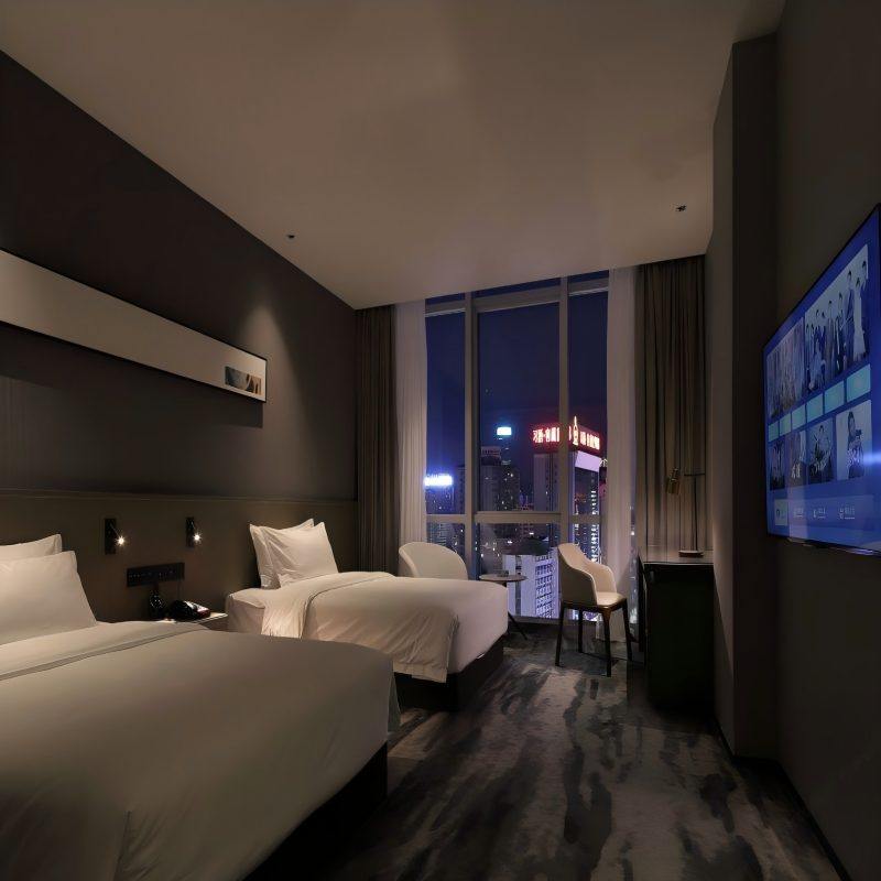 酒店客房设计融合现代轻奢风格,空间宽敞明亮,配备全景落地窗,可俯瞰城市街景或远眺山城风光。高品质床品、静音隔音系统与智能控制系统,为奔波的差旅人士提供深度放松的休憩环境。即便只是短暂停留,也能在繁忙公务之余享受片刻宁静与舒适,实现工作与休憩的完美平衡。