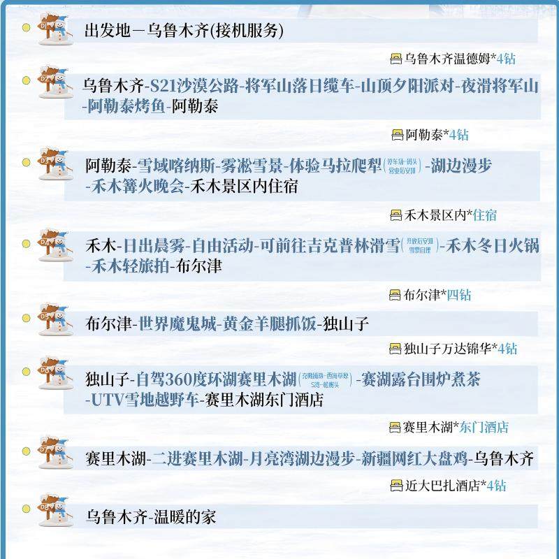 针对经常独自出差的商务旅客,本行程特别支持1人即可成行,无需拼团等待或承担额外费用。无论是临时决定延长假期,还是利用周末开启一场说走就走的新疆滑雪之旅,都能轻松预订。这种高度灵活性完美契合现代差旅人群对时间自主与行程自由的需求,让个人化度假不再受限于团队安排。