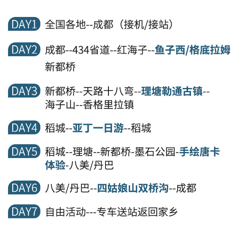 7天6晚的行程设计精准契合现代职场人的休假节奏——只需请2-3天年假,即可拼出完整一周假期。特别适合利用周五下班后出发、下周一返岗的紧凑型差旅度假模式。线路涵盖成都、四姑娘山、稻城亚丁、甘孜、阿坝等川西精华景点,高效串联自然奇观与人文风情,在有限时间内收获最大化的身心放松与视觉震撼。