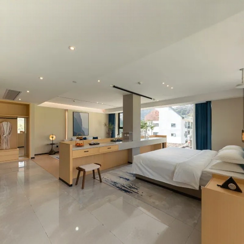栖悦水岸度假酒店提供55平米起的超大客房,配备180°全景落地窗,将遇龙河山水尽收眼底。全屋采用高端智能化家居系统,支持语音唤醒壁炉、智能灯光控制、雾化玻璃及科勒卫浴,观景浴缸更让泡澡成为沉浸式山水体验。无论是商务出差后的放松,还是家庭度假的休憩,这里都能满足您对品质住宿的全部期待。