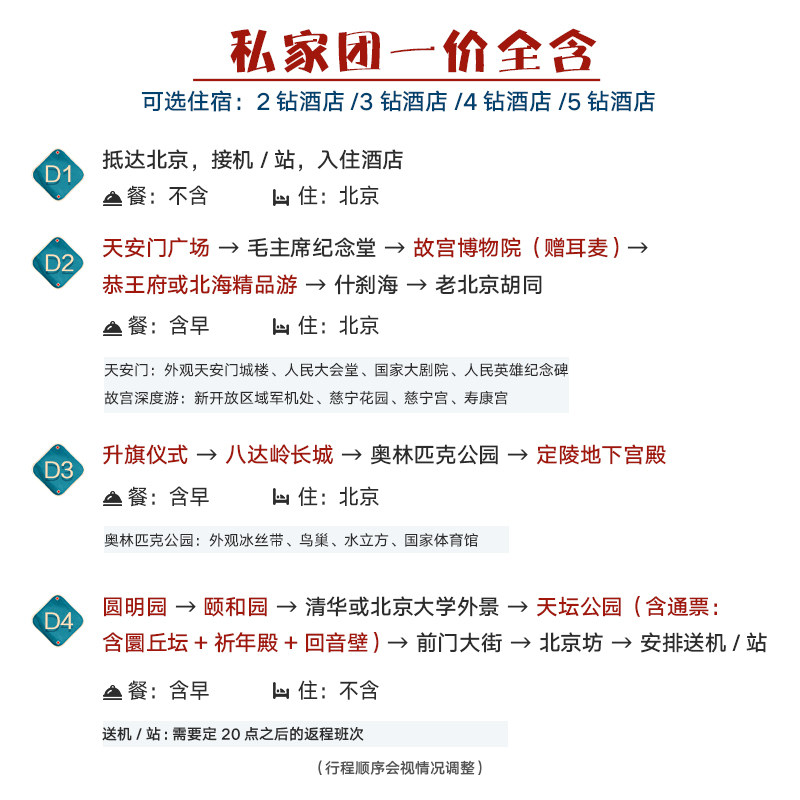 面向广州、深圳等华南商务枢纽城市的差旅人群,本产品提供含机票的一站式北京度假方案。结束繁忙会议或项目后,可直接转场至文化古都北京,私家团形式保障隐私与舒适度,行程涵盖看升旗、登长城、游恭王府等经典体验。2人即可成团,灵活适配差旅结伴出行需求,实现高效工作与深度休闲的完美平衡。