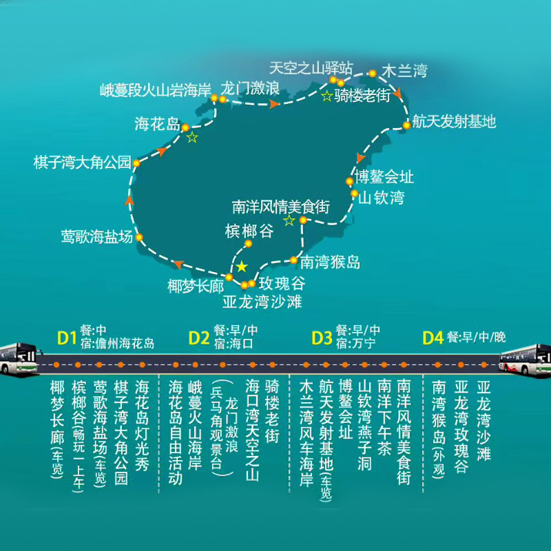 行程精心串联三亚、海口、儋州、万宁、文昌、陵水、保亭七大海南重点城市,形成高效环岛动线。对于需多地拜访客户或考察项目的差旅人士,此路线可一次性覆盖多个业务节点,减少重复往返成本。同时,专业导游与交通安排确保您准时抵达各站点,兼顾商务严谨性与旅游舒适度。
