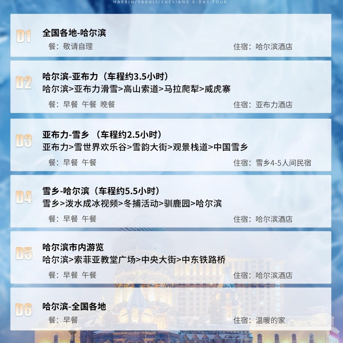针对时间宝贵的差旅人群,行程科学规划6天5晚,高效串联哈尔滨市区、中国雪乡与亚布力滑雪度假区三大经典冰雪目的地。首日抵达即享中央大街夜景,次日深度游览冰雪大世界,第三天前往雪乡体验童话雪景,第四天在亚布力畅享滑雪乐趣,返程前还可参与冬捕体验。节奏张弛有度,确保在有限假期内收获最丰富的北国记忆。