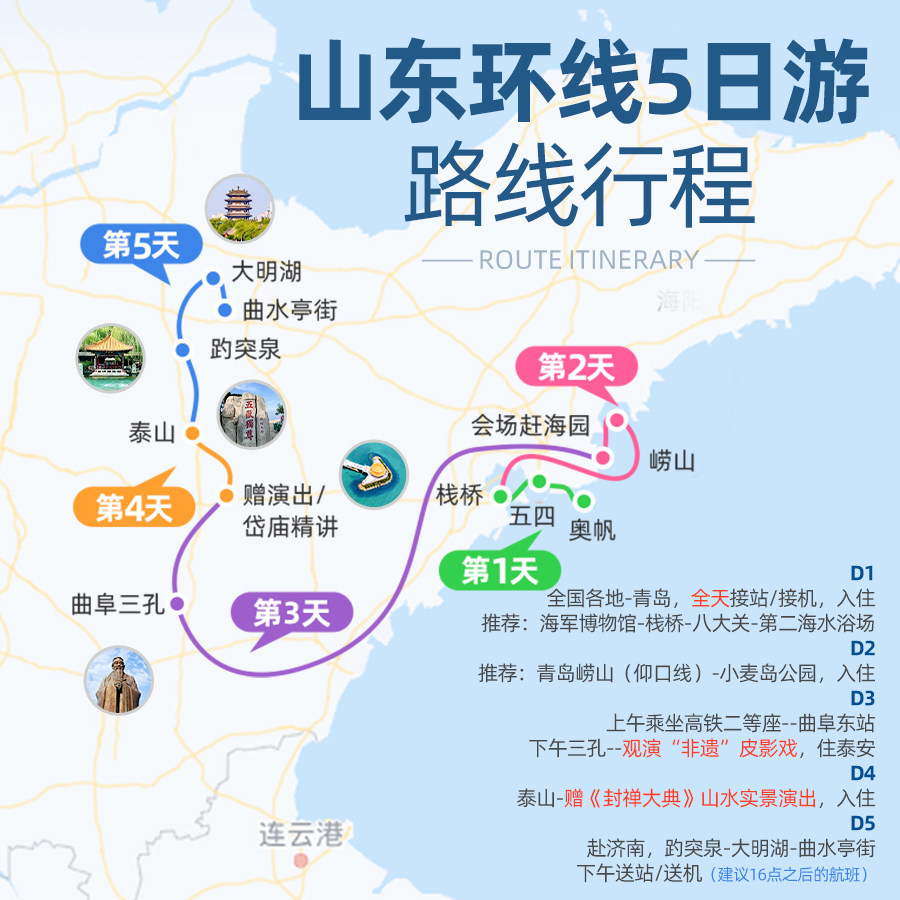 全程依托山东发达的高铁网络,青岛至济南(约3小时)、济南至泰安(约30分钟)、曲阜(约1小时)均可快速抵达。差旅人士无需担忧长途车程耗时,节省的时间可用于工作或深度体验。交通接驳由旅行社统一安排,免除换乘烦恼,让跨城移动如同城通勤般顺畅高效。