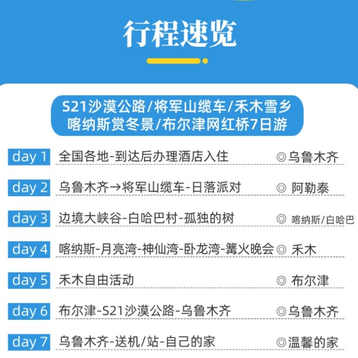 行程以乌鲁木齐为起点和终点,极大便利从全国各地飞抵新疆处理公务的差旅人士。无需额外中转或复杂换乘,落地即可开启旅程,结束时亦可直接返程。全程安排专业接送,节省宝贵时间,让您在有限假期里最大化体验北疆雪景、日落与异域风情。