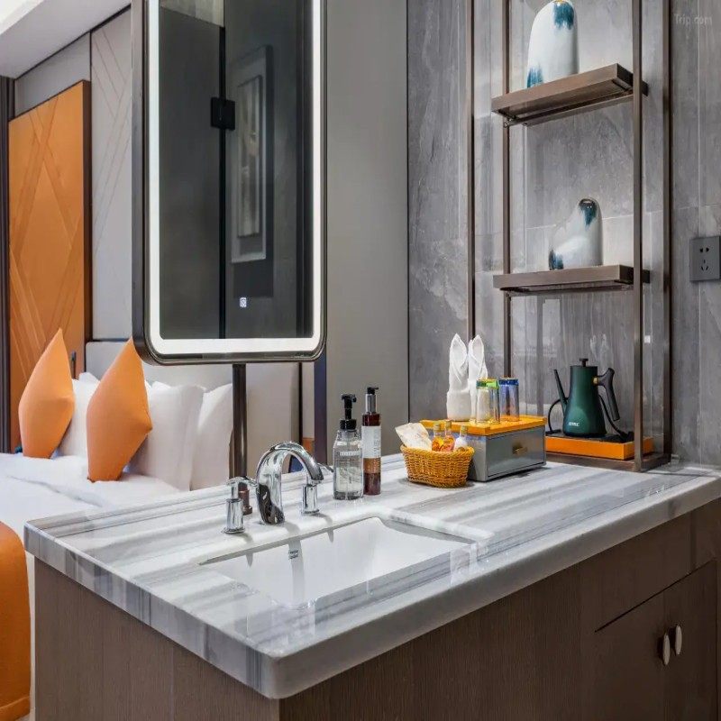 酒店以新中式极简轻奢风为设计理念,将传统东方美学与现代简约功能巧妙融合。木质格栅、素雅色调与柔和灯光共同营造出沉稳而不失格调的居住氛围,有效隔绝外界喧嚣。对于长期处于高压工作状态的差旅人士而言,这样的空间不仅是睡眠之所,更是心灵得以短暂休憩的港湾,助力次日以最佳状态迎接挑战。