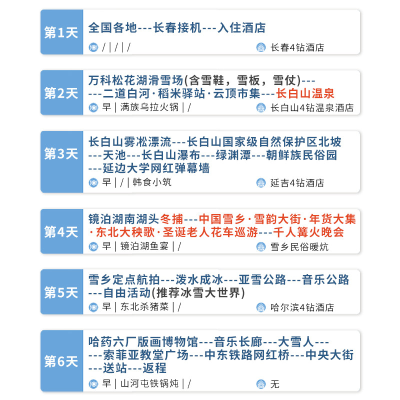 针对年假有限或调休出行的职场人,本产品设计为6天5晚黄金时长,涵盖交通、核心景点与特色体验,节奏张弛有度。从抵达哈尔滨到返程,每日安排清晰高效,避免无效等待与冗余环节,确保在有限时间内收获最大化的冰雪度假价值,契合差旅人群对时间成本的高度敏感。