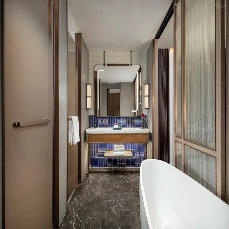 酒店大堂以“运河驳岸”为设计意象,通过流畅的弧形线条营造出江南水韵的流动感,让奔波的差旅者一踏入便感受到杭州独有的文化气息。这种将地域文化与现代酒店功能融合的设计,不仅提升住宿品质,更让短暂的停留成为一场微型城市艺术之旅。