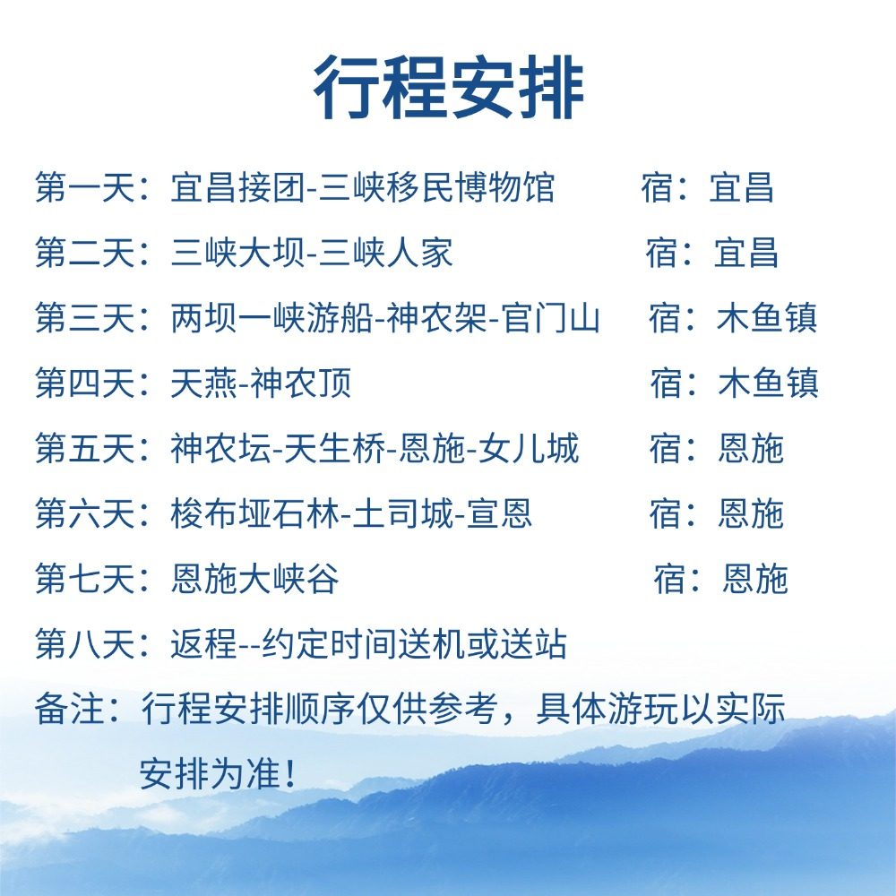 本行程专为从宜昌出发的差旅人士设计,无需额外安排跨城交通,节省宝贵时间与精力。宜昌作为湖北重要交通枢纽,无论是高铁、飞机还是自驾都极为便利,让商务出行后的度假衔接更加顺畅。您可在完成工作后直接开启8天7晚的深度休闲之旅,真正实现‘工作结束即度假开始’的无缝切换体验。