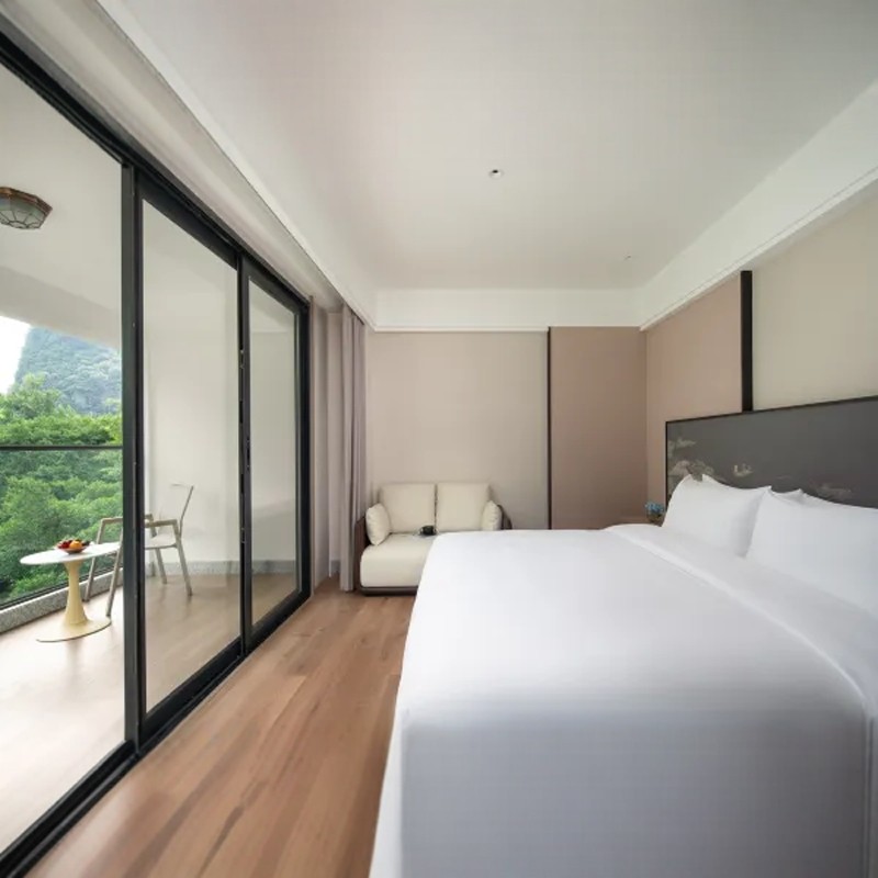 漓境度假酒店提供大床/双床多种房型,均配备干湿分离卫浴与高品质慕思床垫,确保差旅人士获得深度休息。阳台设计可远眺山景,有效缓解视觉疲劳。安静舒适的睡眠环境对高强度工作的商务人士尤为重要,助力次日保持清晰思维与高效执行力。