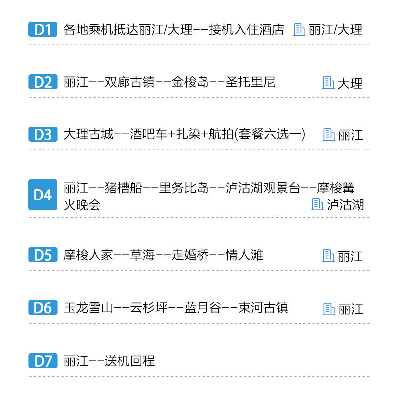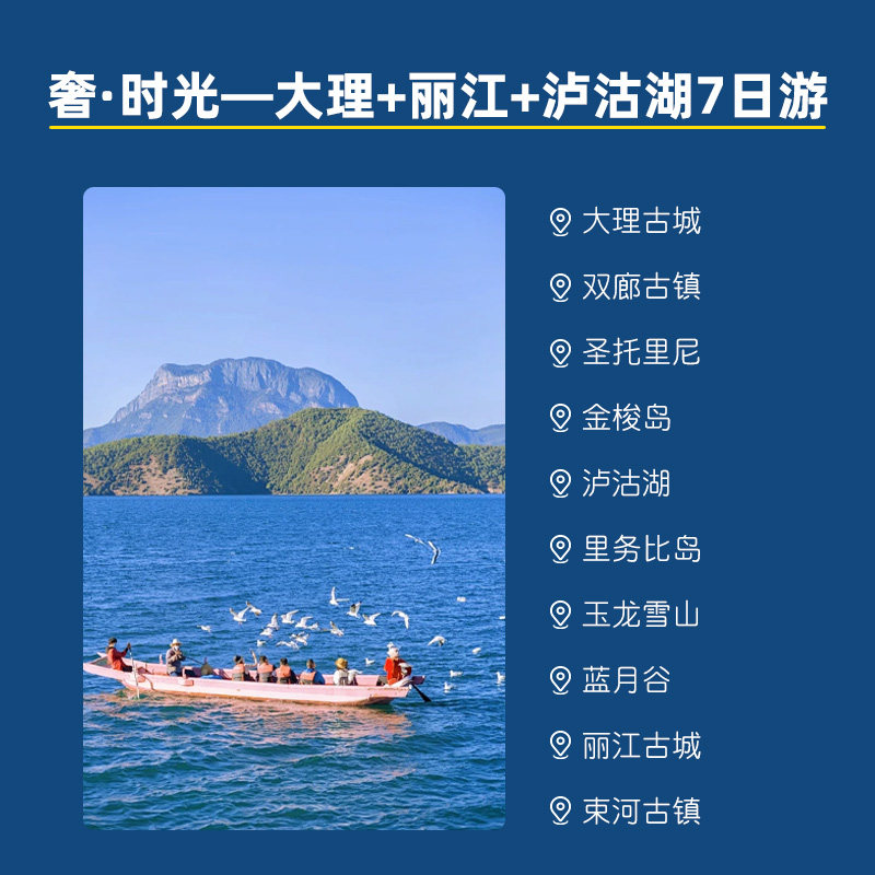 线路精心设计,从丽江出发,串联大理、泸沽湖、玉龙雪山、双廊、束河、金梭岛等核心目的地,避免重复往返,最大化利用有限差旅假期。每日车程合理,景点衔接流畅,让您在7天内高效领略滇西北自然风光与人文风情,实现‘一次出行,多重体验’的差旅价值最大化。