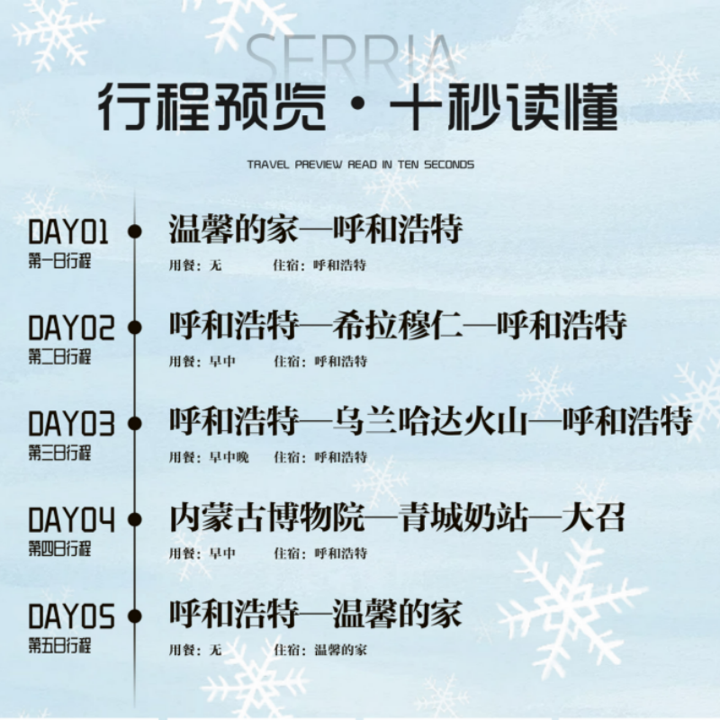本产品为冬季限定线路,充分利用内蒙古12月至次年2月的独特气候资源。此时草原雪覆如毯、火山银装素裹,搭配零下气温形成的雾凇奇观,构成全年仅此一季的视觉盛宴。差旅人士可借此机会收获稀缺性体验,在朋友圈或客户分享中彰显独特品味,为商务社交增添话题亮点。