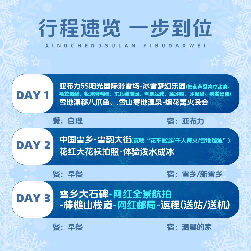 行程融合“主题乐园”“冰雪派对”等多种标签元素,满足不同差旅人群的个性化需求。无论是想体验冰雪主题娱乐设施,还是参与热闹的冬季派对活动,都能在此行程中找到契合点。这种多元化设计让独自出差者也能享受丰富社交与娱乐,避免旅途孤独感,提升整体满意度。