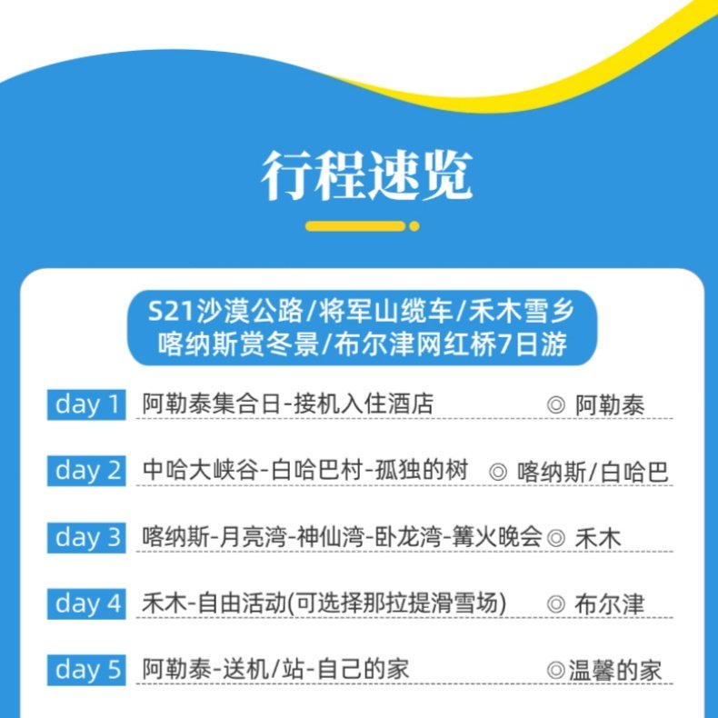 精心设计的5天4晚行程,可灵活衔接周五下班至下周初返岗,或利用年假+周末组合实现无缝出行。无需长时间请假,即可深入阿勒泰核心景区,是现代职场人平衡事业与生活的理想差旅度假方案。