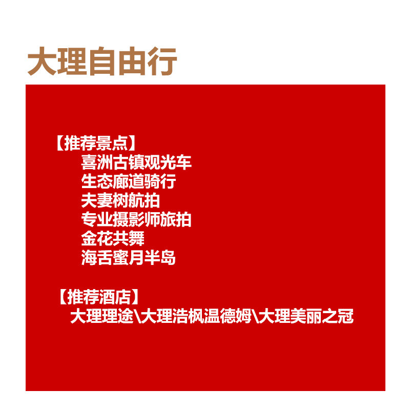 从怒江出发的差旅者无需复杂准备,本产品已整合交通、住宿、特色体验等核心要素,尤其适合短期出差兼度假场景。只需携带基础行李,即可在大理享受包含旅拍、航拍、城市观光在内的丰富内容,减轻行前规划负担,提升差旅效率与体验品质。