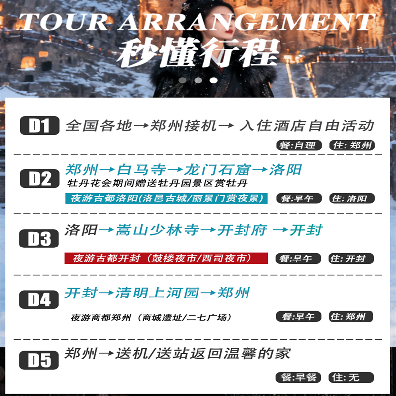 行程以郑州为起止点,充分利用其作为中原交通枢纽的优势,便于全国乃至国际差旅人士抵达与返程。全程安排正规旅游巴士,景点间车程合理规划,避免无效等待。对于需在行程结束后立即投入工作的旅客,此设计极大提升了时间利用效率,实现‘落地即游、游毕即归’的高效差旅闭环。