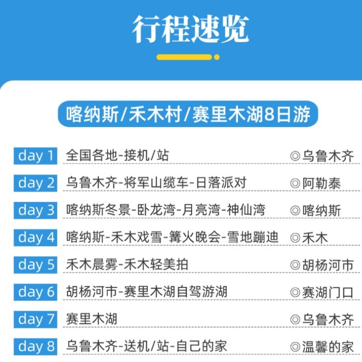 行程精心设计为8天7晚的闭环路线,从乌鲁木齐出发,途经赛里木湖、阿勒泰、喀纳斯、将军山滑雪场及沙漠公路,高效串联新疆北疆精华景点。对于时间紧凑的差旅人士而言,无需多次中转或额外规划,一次出行即可体验湖泊、雪山、沙漠、森林等多元地貌,最大化利用有限假期。