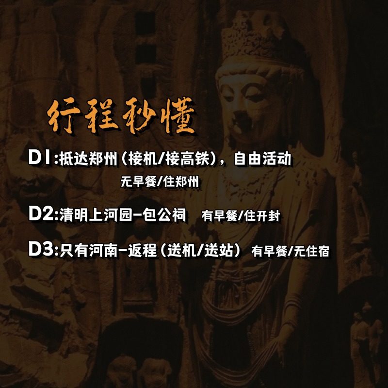 专为时间宝贵的差旅者设计,三日内高效串联清明上河园、包公祠与只有河南三大IP。无需自行规划路线与门票,全程由专业团队安排,省去琐碎环节。您可在北宋繁华街市中漫步,在包公断案故事里感悟正义,在沉浸式剧场中读懂河南五千年文明,实现文化深度游与差旅效率的完美统一。