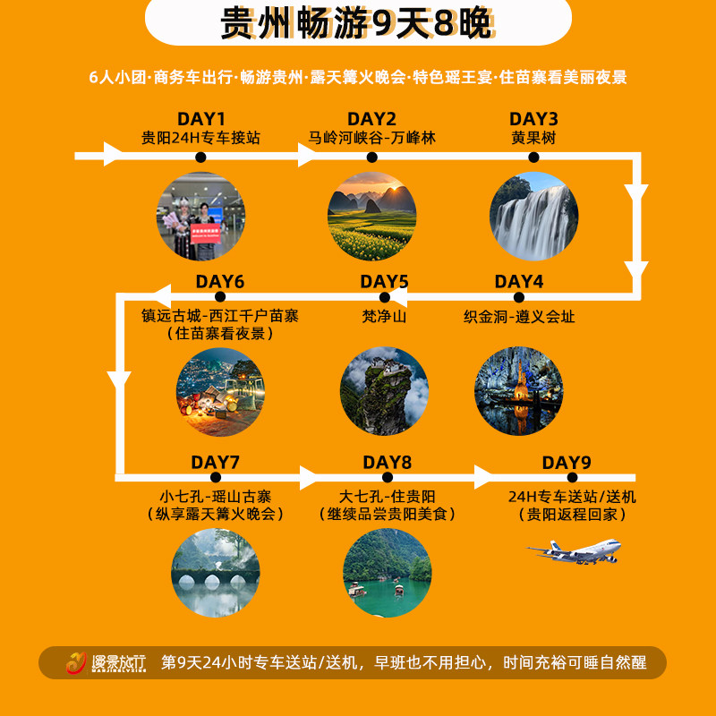 本行程支持1人单独预订,无需拼团等待,特别适合独自出差后顺道度假的商务人士。从贵阳出发,9日内深度游览黄果树瀑布、西江千户苗寨、小七孔、梵净山等贵州精华景点,行程节奏张弛有度,既满足高效差旅后的放松需求,又兼顾文化体验与自然风光。小团模式保障私密性与服务品质,让您的差旅延伸之旅轻松无忧。