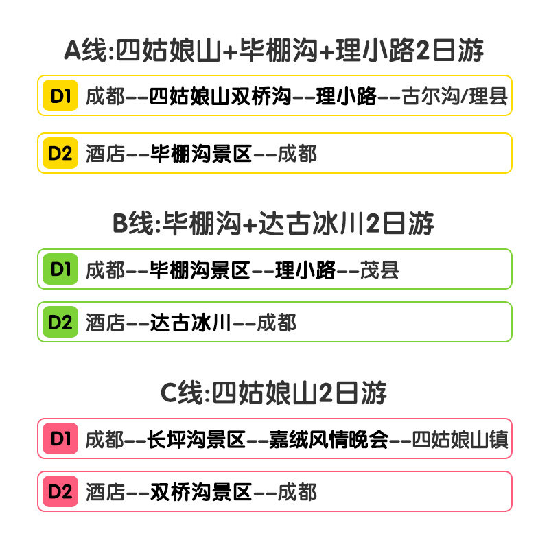 采用2-8人小团形式,避免大型旅行团的嘈杂与低效,更适合差旅人士对私密性与灵活性的需求。小团可快速协调行程节奏,减少无效等待,同时配备专业向导,确保在有限时间内高效游览四姑娘山双桥沟、长坪沟、达古冰川及毕棚沟等核心景点,让短暂假期也能收获满满。
