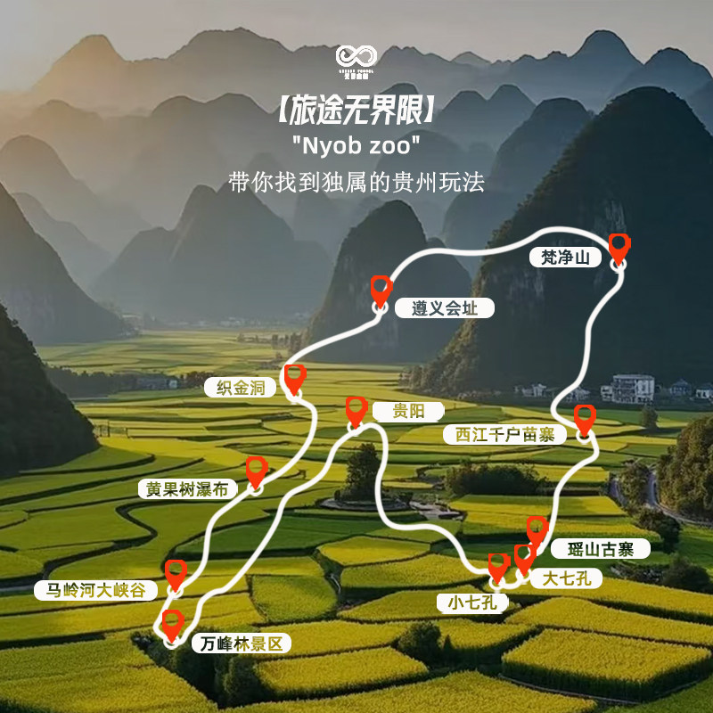 行程从贵阳出发,高效串联安顺(黄果树瀑布)、黔东南(西江千户苗寨)、黔南(小七孔)、铜仁(梵净山)、毕节(织金洞)、黔西南(万峰林)六大目的地,覆盖贵州最具代表性的自然与人文景观。差旅人士可在有限时间内深度体验多彩贵州,避免多次往返的繁琐,实现一次出行、多重收获。