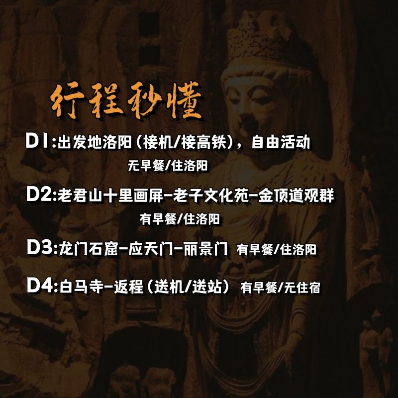 本行程支持1人单独预订,无需拼凑多人,特别适合商务出差间隙或独自度假的旅客。无论是临时起意的小长假,还是项目结束后的放松之旅,都能快速成行,省去等待拼团的时间成本。4日紧凑行程覆盖洛阳核心文化景点,兼顾效率与体验,让差旅人士在有限时间内深度感受中原古都魅力。