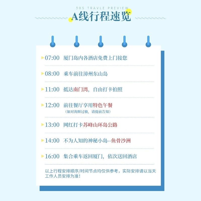 全程设计为一日游,清晨从厦门出发,傍晚返回,完美适配周末或工作日间隙出行需求。无需额外请假或调整住宿,高效利用碎片时间完成海岛度假。含接送与午餐的全包式服务,进一步减少决策成本,让差旅人士真正实现‘即刻出发,轻松回归’。