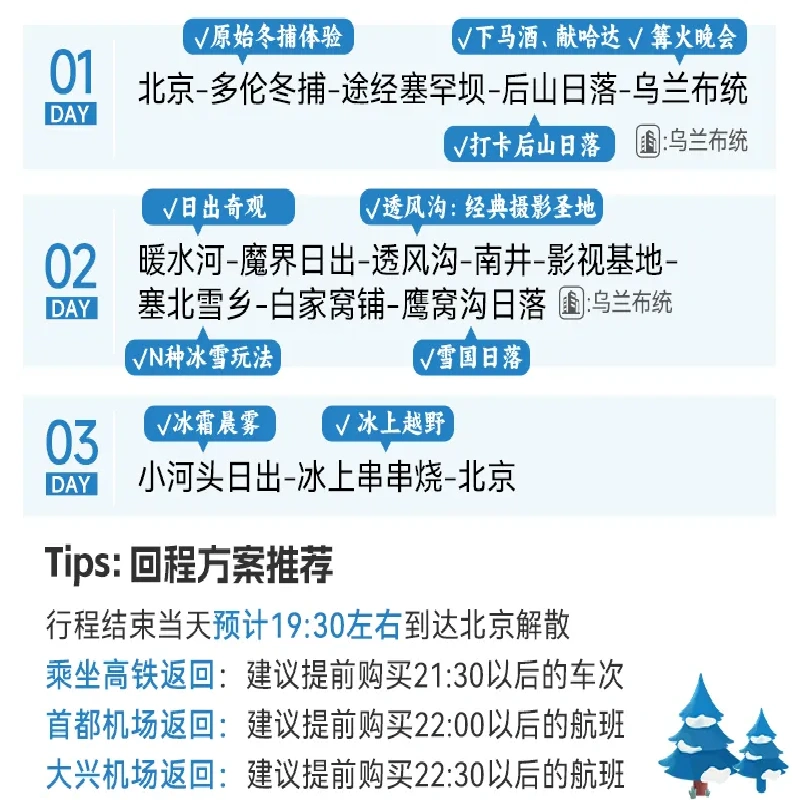 精心规划3日行程,涵盖塞罕坝雪原、魔界日出、乌兰布统草原等核心景点,节奏张弛有度。首日傍晚出发、第三日下午返程,最大限度减少占用工作日,适合周五下班后启程、周一上午返岗的差旅节奏,高效利用碎片假期。