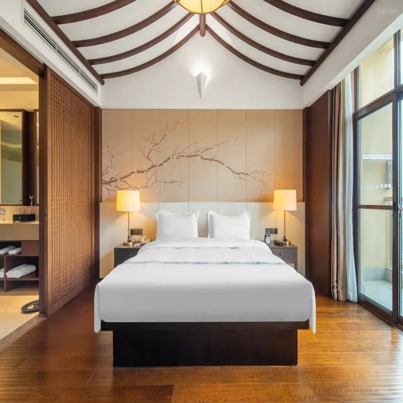 酒店以中式园林为设计蓝本,亭台水榭、曲径通幽,将传统美学与现代功能融合。对于需要远程会议或文案工作的差旅者,这样的环境既能激发灵感,又有效隔绝喧嚣。在青瓦白墙与绿植环绕中处理邮件,效率与心境同步提升,重新定义商务住宿的审美标准。