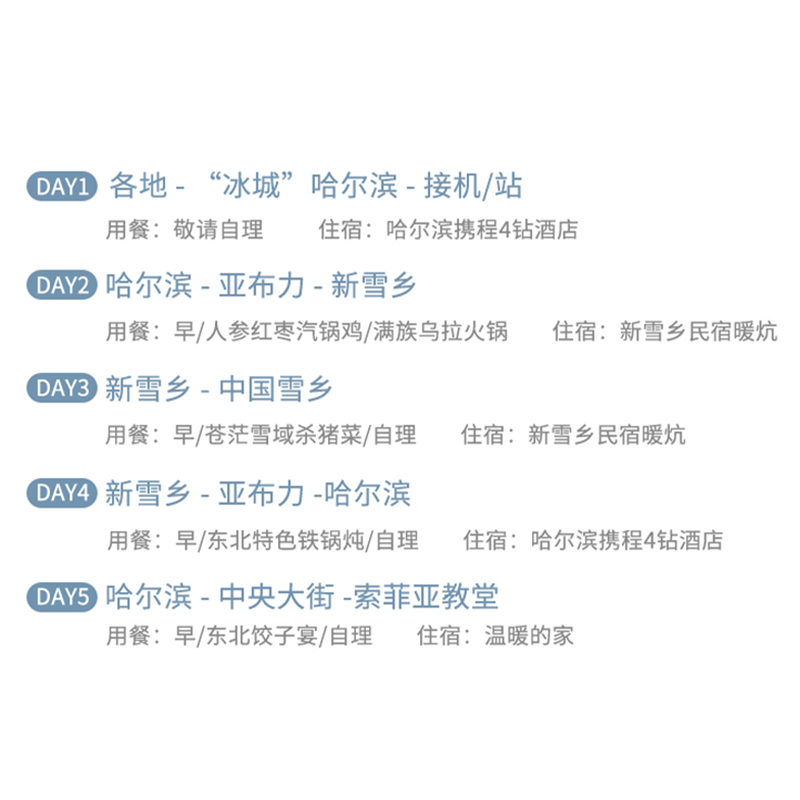 5天4晚行程科学规划,高效串联哈尔滨市区、亚布力滑雪场与双雪乡核心景点,避免重复奔波。对于时间宝贵的差旅人群,此线路最大化利用有限假期,一次打卡东北三大冰雪IP——冰雪大世界、亚布力专业雪道、雪乡童话雪景,省去自行规划交通与门票的繁琐,让差旅度假事半功倍。