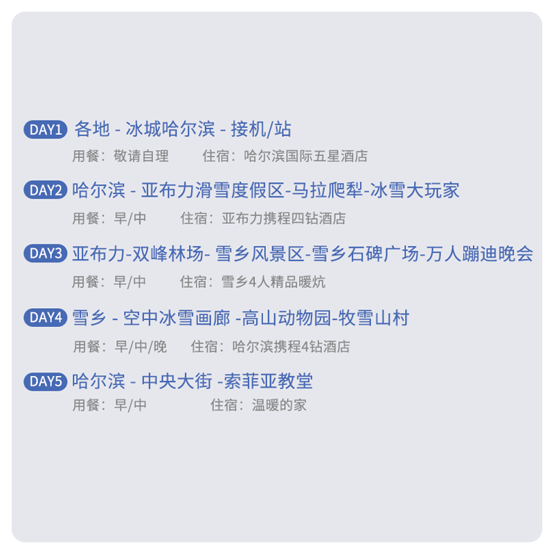 在年终冲刺或年初规划的关键阶段,一次高效的冰雪假期能有效调节身心状态。本产品将哈尔滨、亚布力、雪乡三大经典目的地串联,5天4晚的时长适配多数企业年假或调休安排。来自上海、广州、成都等温暖城市的差旅者,可借此机会体验极致冬日风情,在冰天雪地中重置工作节奏,以更佳状态迎接新挑战。