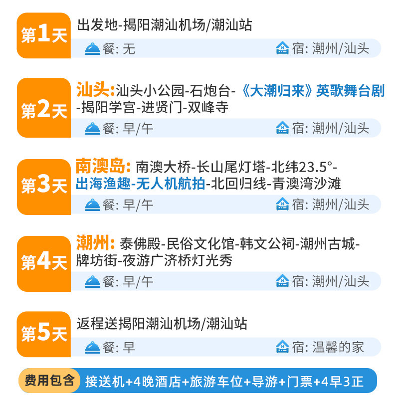 巧妙串联汕头、潮州、揭阳三大潮汕核心城市,覆盖海岛、古城、美食、非遗等多元体验。对于需在粤东多地出差的商务人士,此行程可高效整合多地资源,避免重复交通耗时,实现‘一次出行,多重收获’,大幅提升差旅综合效益。