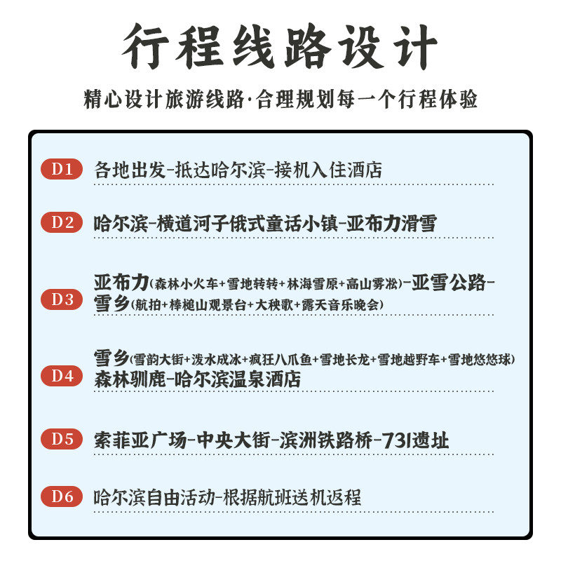 本线路支持1人即可成行,无需拼团等待,特别适合独自出差或临时调休的商务人士。行程安排紧凑而充实,既涵盖冰雪大世界、亚布力滑雪等标志性体验,又预留自由活动时间,让您在繁忙工作之余,轻松享受一段专属的北国浪漫时光。