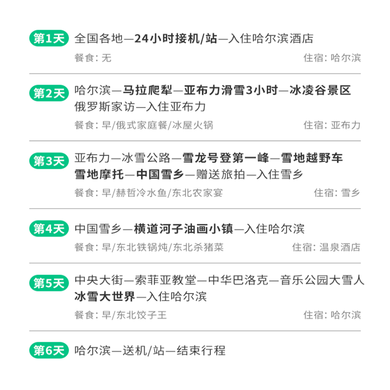 6天5晚的行程长度精准匹配多数企业年假或周末+调休组合,便于差旅人士灵活安排行程。既避免过短导致体验仓促,又防止过长影响工作节奏。合理的时间分配覆盖城市、雪乡、滑雪、温泉四大核心板块,实现高效利用假期,最大化差旅休闲收益。