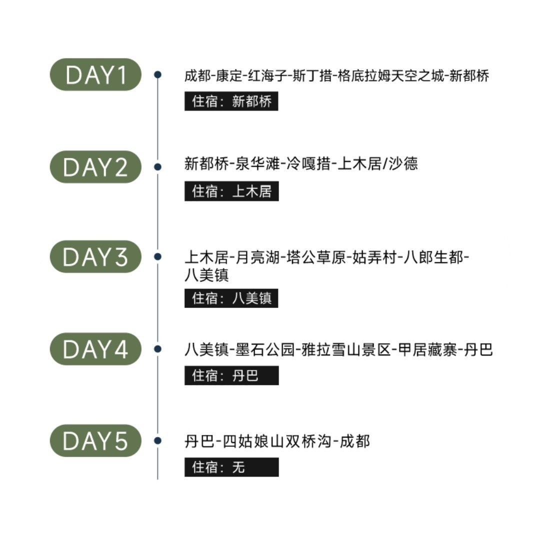 精心设计的5日行程,既不过于仓促也不冗长,完美适配周末+年假或调休组合。从成都出发并返回,起止便利,便于差旅人士灵活安排。每日景点衔接流畅,住宿与交通均已优化,确保您在有限时间内获得最大旅行价值。