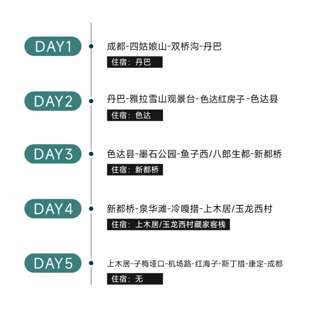 5天4晚的行程设计精炼高效,覆盖川西核心景点却不显仓促,完美适配大多数企业给予的年假或调休周期。无需请长假,即可完成一次高浓度的自然与文化之旅,最大化利用有限的差旅闲暇时间。