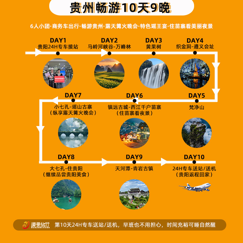 全程以贵阳为起止点,形成高效省内闭环路线,避免跨省交通耗时与复杂中转。对飞抵贵阳龙洞堡机场的差旅人士而言,落地即开启旅程,结束直接返程,极大简化行程规划。10日内深度游遍贵州精华,既完成多地公务目标,又无需额外安排交通接驳,真正实现‘一次出行,多重收获’的差旅理想。