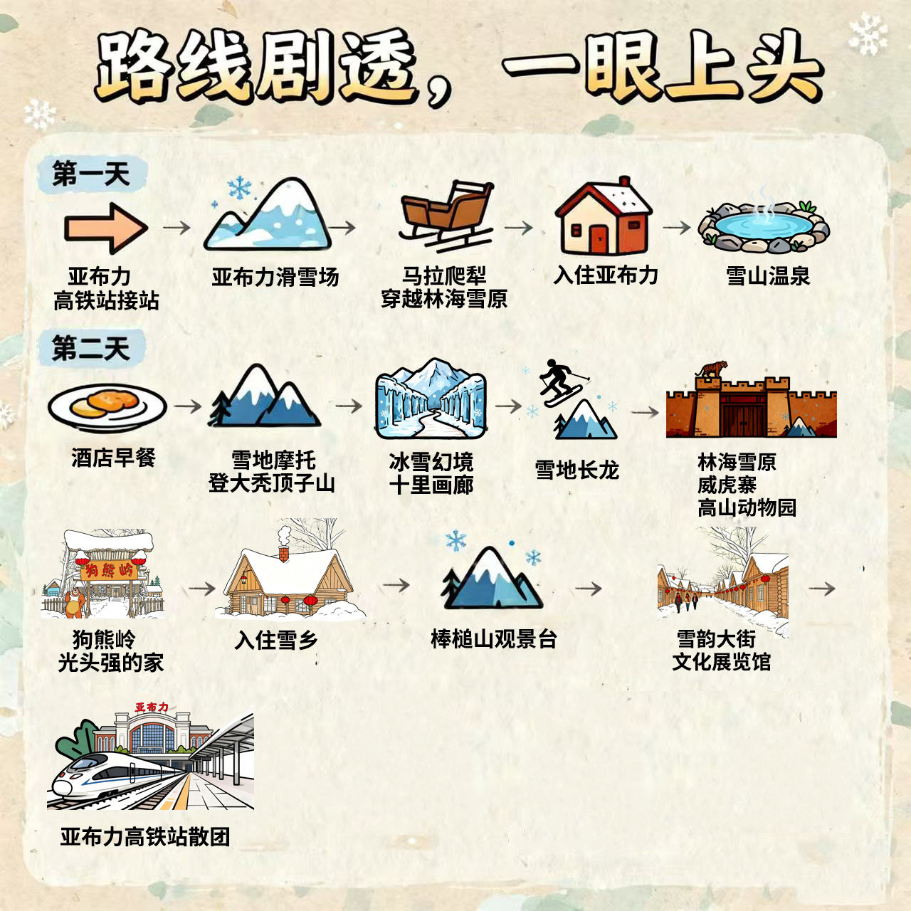 精心设计2天1晚行程,周五下班后或周末出发即可完成雪乡-亚布力精华游,周一清晨返程不影响工作。高铁+包车组合确保时间精准可控,避免冗长交通消耗。高效利用碎片假期,实现‘短假高质’的差旅休闲平衡,特别适合时间紧张的职场精英。