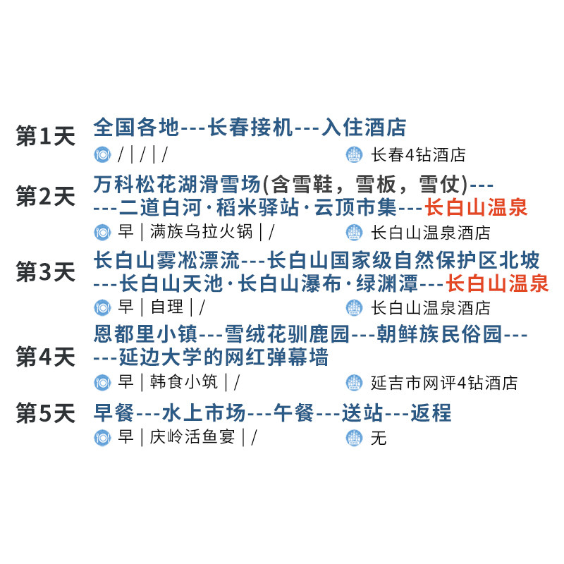 支持单人预订机制,特别适合独自出差或临时调休的商务人士。无论您从广州、厦门、武汉还是兰州出发,均可便捷参与本次5日行程。内容涵盖滑雪、温泉、长白山观光及特色餐饮,无需拼团等待,差旅结束即可启程,灵活高效。