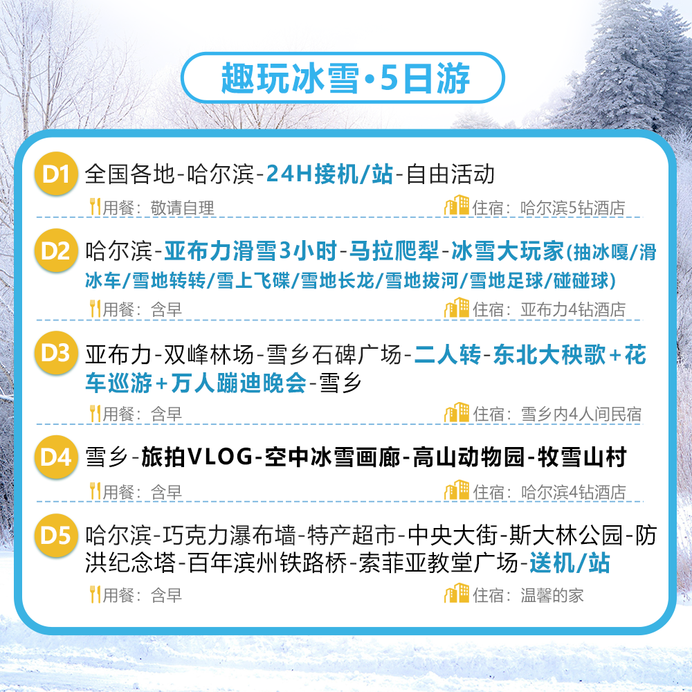 本产品支持1人独立预订,特别适合差旅人士在公务之余灵活安排休闲时光。无需等待拼团,随时出发,节省时间成本。行程涵盖哈尔滨市区、亚布力滑雪场及中国雪乡,兼顾商务出行的效率与度假体验的深度,让差旅不再单调,轻松实现工作与放松的完美平衡。