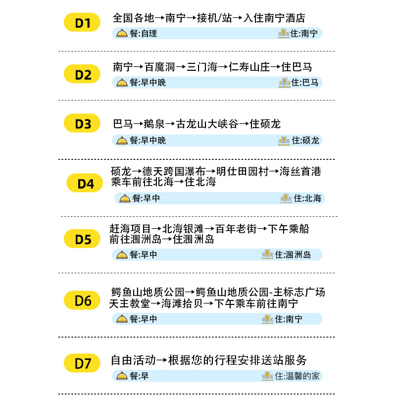 本行程专为兼顾差旅与休闲需求的旅客设计,从南宁出发,覆盖崇左、百色、北海、河池等广西核心城市,7天6晚深度体验德天瀑布、三门海、巴马长寿之乡等自然人文景观。行程安排紧凑而不仓促,适合商务出差后顺道度假,或团队差旅之余放松身心,真正实现工作与休闲的无缝衔接。