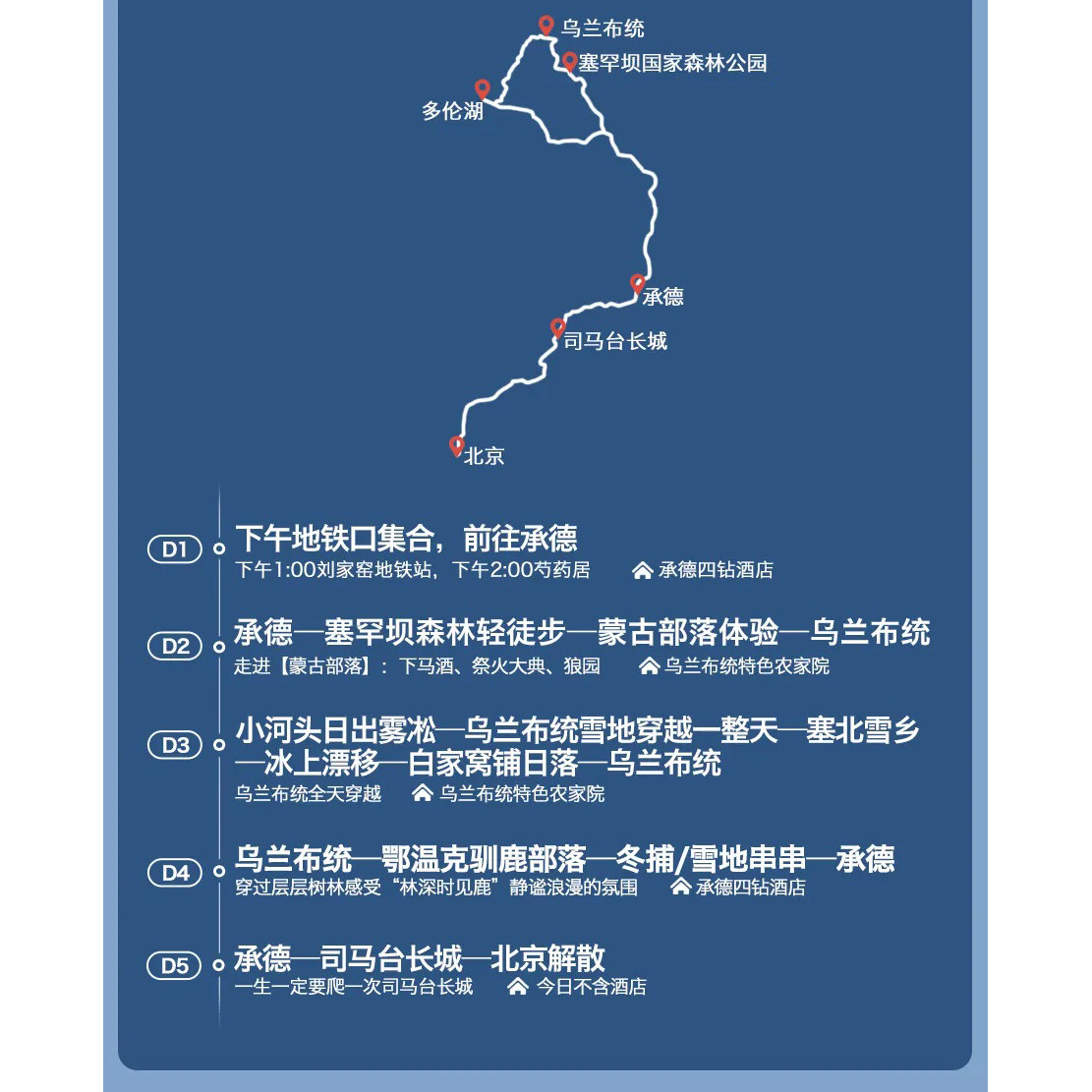 5日行程高效串联塞罕坝国家森林公园、鄂温克民族风情区、司马台长城及乌兰布统草原雪原,地理跨度虽广但路线优化,避免无效奔波。每日车程合理,景点衔接流畅,特别适合时间宝贵的差旅人群。在有限假期中深度体验森林、草原、长城与民族文化的多元交融,最大化旅行价值。