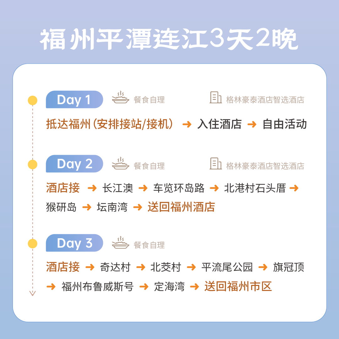本行程专为福州本地或周边差旅人士设计,无需额外安排大交通,节省时间与成本。从三坊七巷到平潭猴研岛、连江奇达村,全程3天2晚紧凑高效,既能满足商务出差后的放松需求,又可深度体验闽都文化与海岛风情,真正实现‘工作度假两不误’。