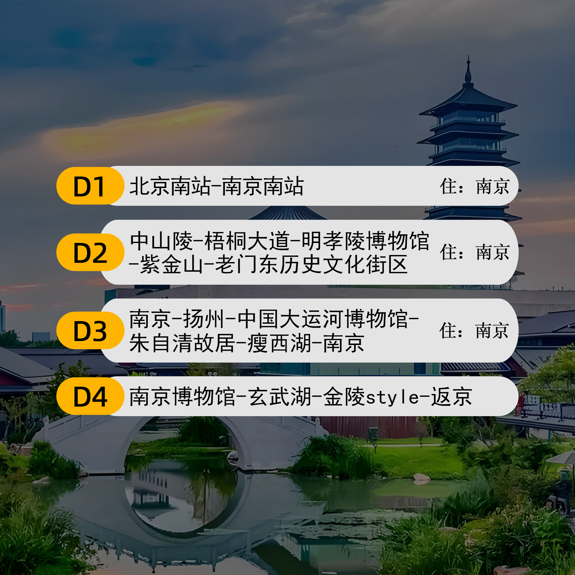 专为忙碌职场人设计的4天3晚行程,精准匹配小长假或调休窗口。首日抵达南京即开启都市观光,次日深度游览金陵名胜,第三天转场扬州感受江南慢生活,末日返程前仍可处理紧急工作。全程无冗余交通耗时,景点间衔接流畅,确保每一分差旅时间都被高效利用,实现‘短假长享’的度假效果。