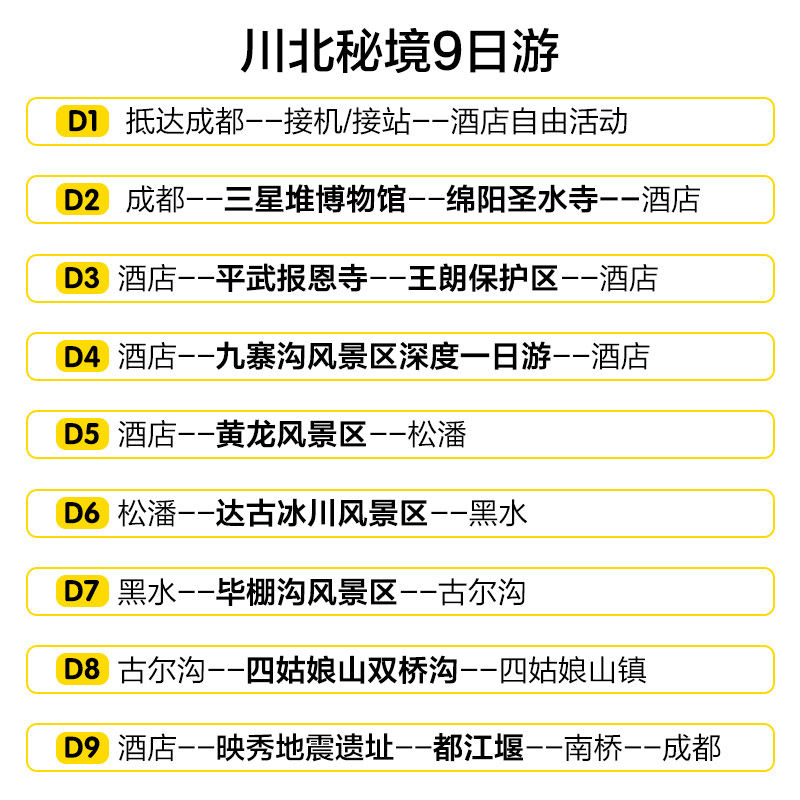 9天8晚的行程长度精准匹配多数企业差旅后的调休或年假周期。从前端城市(成都/绵阳)出发,经高原秘境再返回起点,形成高效闭环。既避免过短行程的仓促感,又防止假期过度消耗,确保差旅人士在有限时间内获得充分放松与难忘体验。