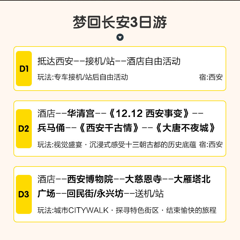本产品支持“1人可订”,特别适合因公出差后临时决定延长假期的商务人士。无需等待拼团或协调多人时间,下单即确认,极大提升了差旅与休闲结合的灵活性。无论是独自出差后的文化探索,还是临时起意的城市微度假,都能轻松实现,让您的西安之行说走就走,高效又自在。